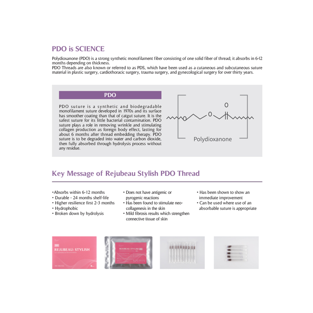Polydioxanone (PDO) is a strong synthetic monofilament fiber consisting of one solid fiber of thread; it absorbs in 6-12 months depending on thickness. PDO Threads are also known or referred to as PDS, which have been used as a cutaneous and subcutaneous suture material in plastic surgery, cardiothoracic surgery, trauma surgery, and gynecological surgery for over thirty years.
